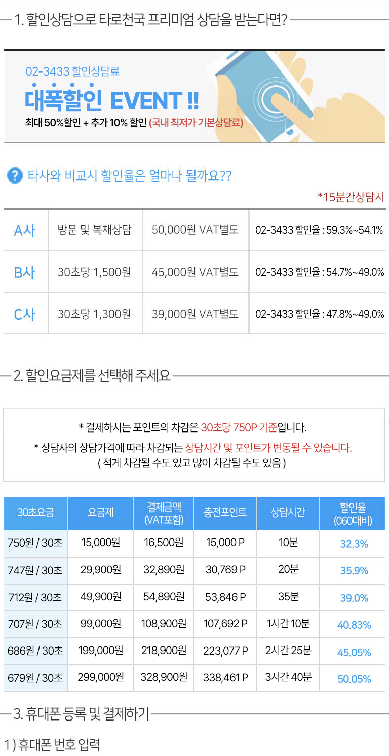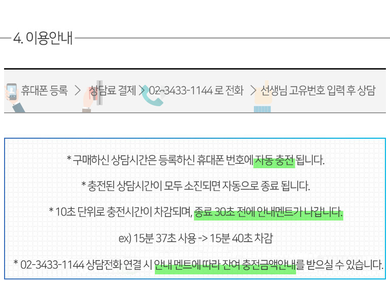 충전 후 상담하기 버튼 클릭 + 할인상담(02-3433-1144) 전화 + 선생님 고유번호 입력 후 상담